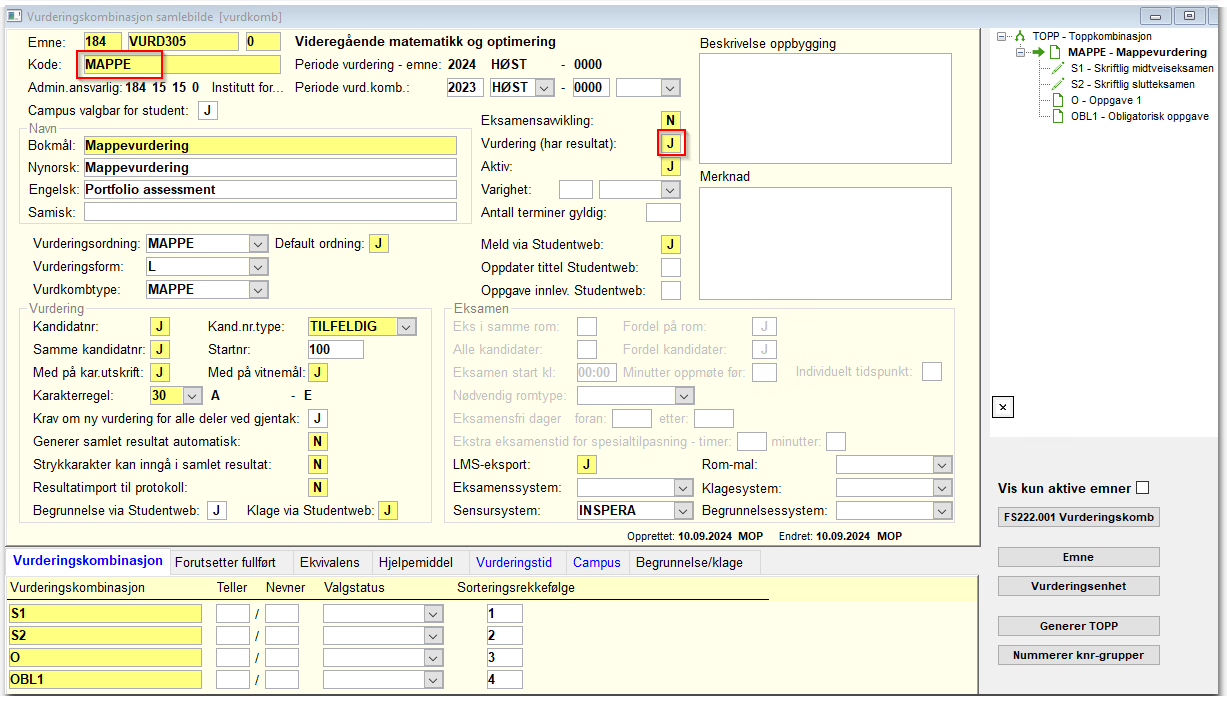 Maler/eksempler for oppbygging av vurderingskombinasjoner