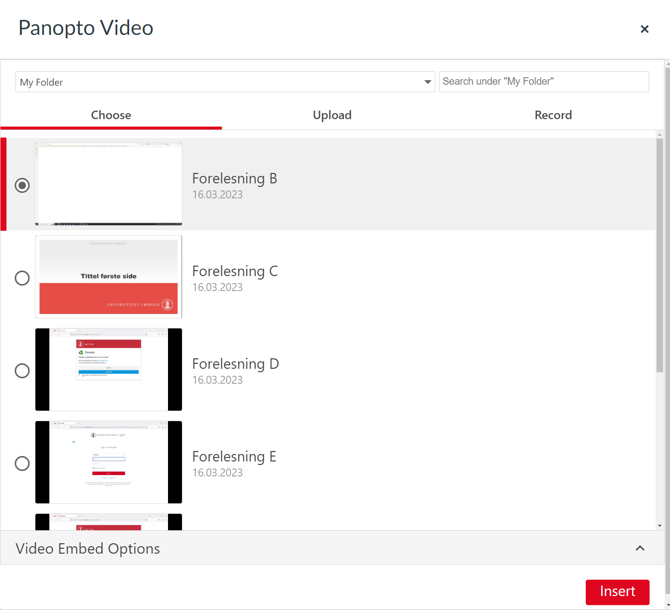 Embed av Panopto-videoer inn i Mitt UiB moduler og sider